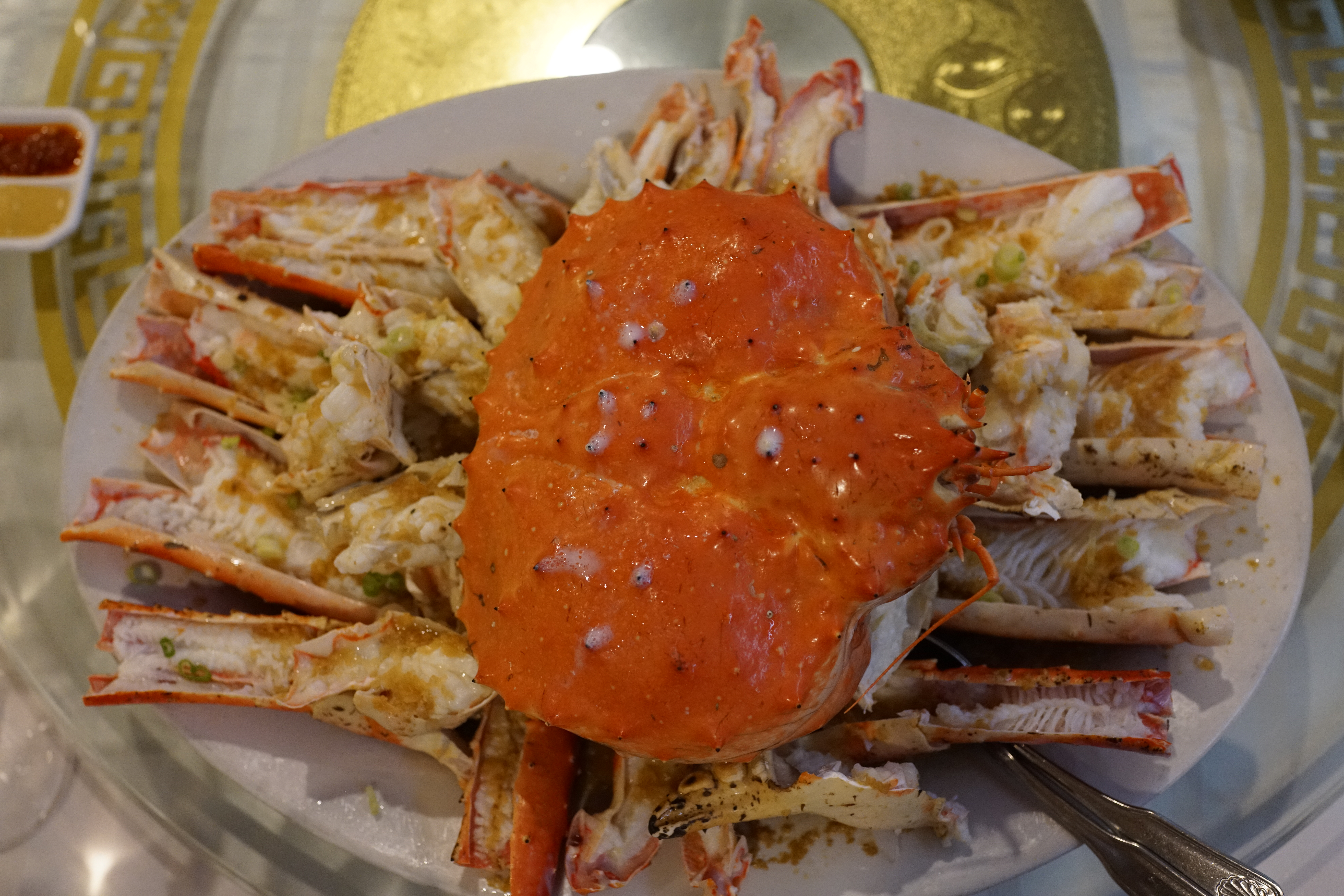 Will pre-ordered two giant king crabs and a group of us, including chef Masa, went to Oriental Garden for a traditional Chinese feast, beginning with geoduck sashimi, then live shrimp, then the crab served 3 ways etc — we drank 1985 Sassicaia, 1985 HB and 1968 Riscal with the Peking Duck — there was a great Magnum of 2007 Roulot Meursault and I loved the perfect bottle of 1968 Tondonia blanca.